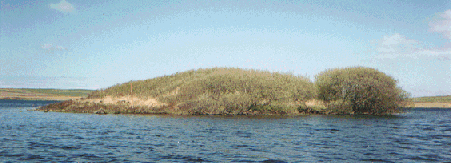 Although the suspected artificial island is located 181m from the E shore of Loch Gorm, it can be easily waded to without the water ever reaching above the knees. The suspected artificial island is an oval shaped islet which measures 107m N-S by 77m E-W at its base. The outer margin of the islet is ringed by a 20m wide spread of large and medium sized stone which sharply contrasts the surrounding sandy loch bed. The sides of the islet are composed of a scatter of small stone, which rises up gradually at a 4° angle from the loch bed to form an oval shaped platform, measuring 63m N-S by 38m E-W. The surface of the islet was heavily vegetated and covered with dense clumps of willow, briars and turfs of long grass at the time of survey.