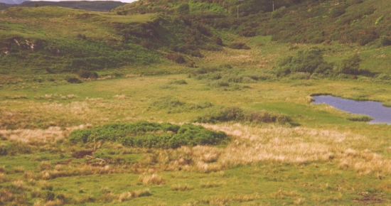 This artificial island is located 30m SW of the present shoreline of Loch nan Deala and 26m NE of the loch’s former shoreline. The site was accessed from the SW shore by a 3m wide causeway of large boulders who’s tops were, on average, 0.5m below the upper platform of the artificial island. The water surrounding the site would have been roughly 1m in depth, with deeper 1.5-2m water located behind the site to the NE.